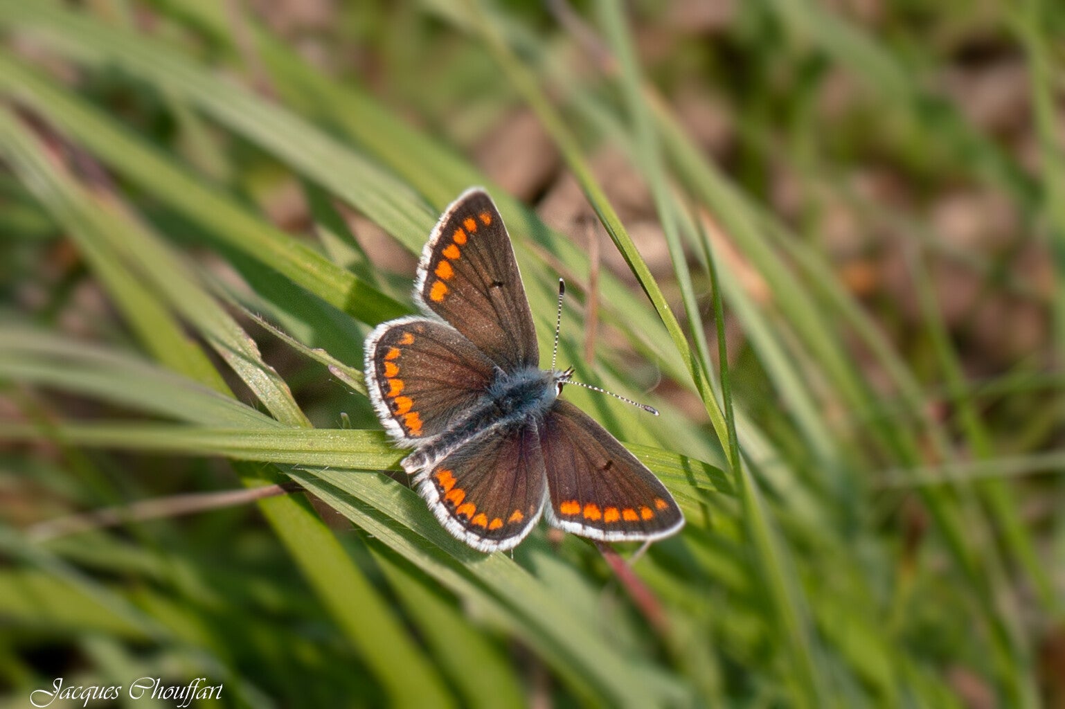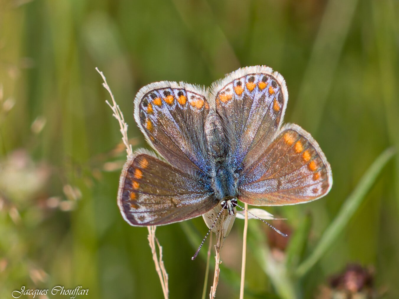 Le dessus des ailes du mâle est bleu, celui de la femelle est brunâtre avec des lunules (taches en demi-lune) oranges aux extrémités des ailes.