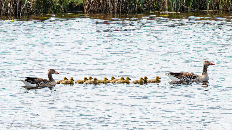 L'Oie cendrée, la plus grande des oies sauvages, a un bec orange puissant par rapport à celui des autres oies et ses pattes sont de teinte rose. Elle doit son nom aux plages cendrées sur les ailes mais on ne voit ces dernières qu'au vol. Les oies forment des couples fidèles pour la vie.