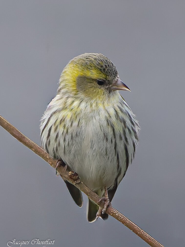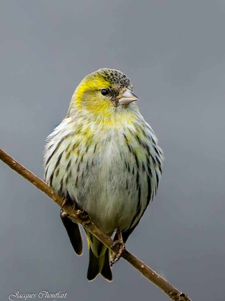 Le mâle a la poitrine jaune mais une calotte et un menton noirs lui sont propres.