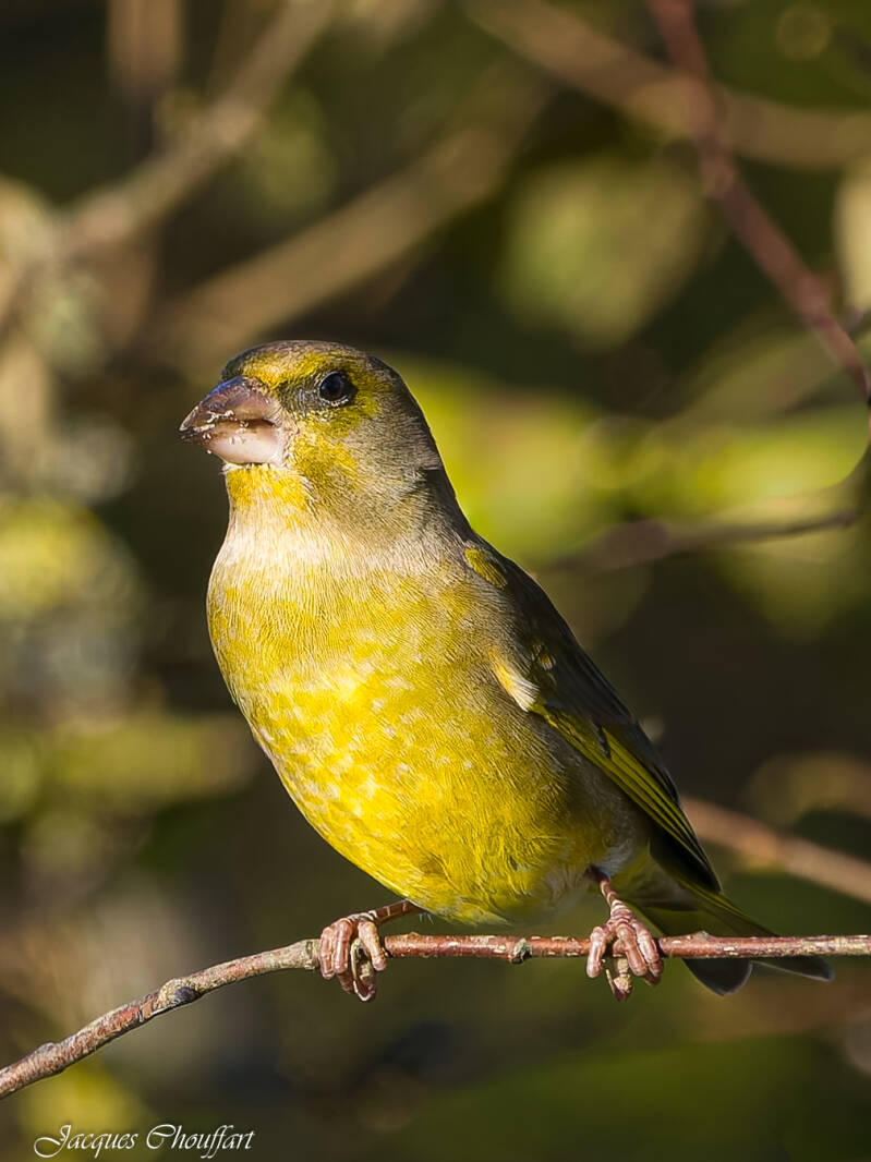Le Verdier d'Europe a des barres alaires jaunes mais, comme son nom l'indique, la teinte générale de son plumage sobre est le vert. Son bec est assez puissant, lui donnant l’allure d'un « moineau vert».