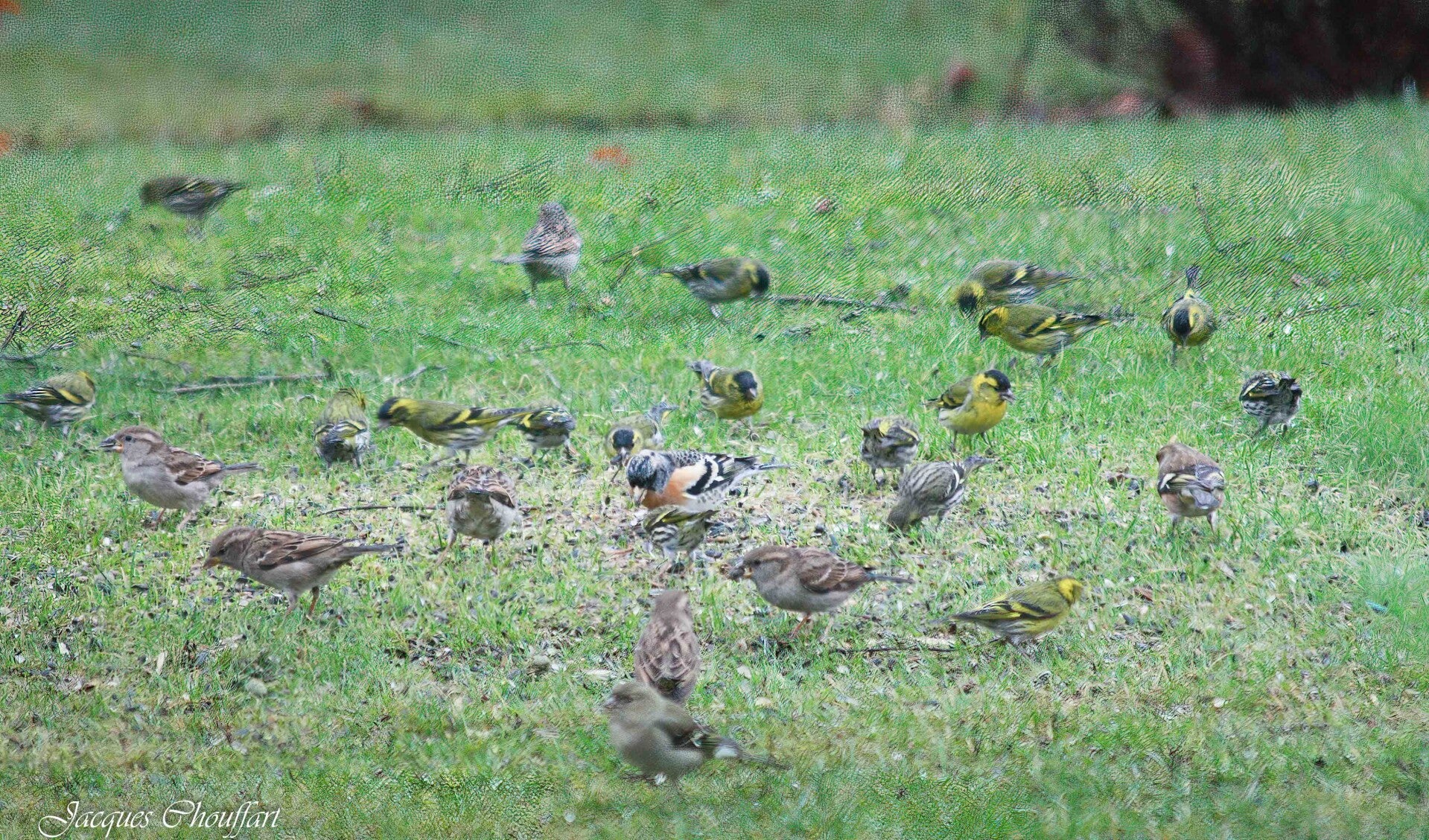 Une bande de Tarin des aulnes vient d'envahir le jardin. On peut observer sur la photo des Moineaux domestiques, un pinson du Nord, quelques pinsons des arbres.