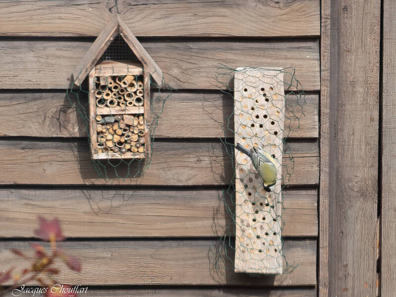 La mésange charbonnière pille les larves ou les oeufs présents dans les hôtels à insectes.