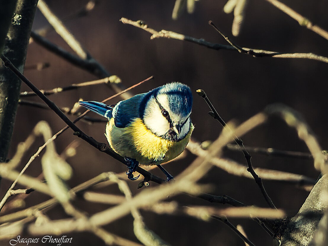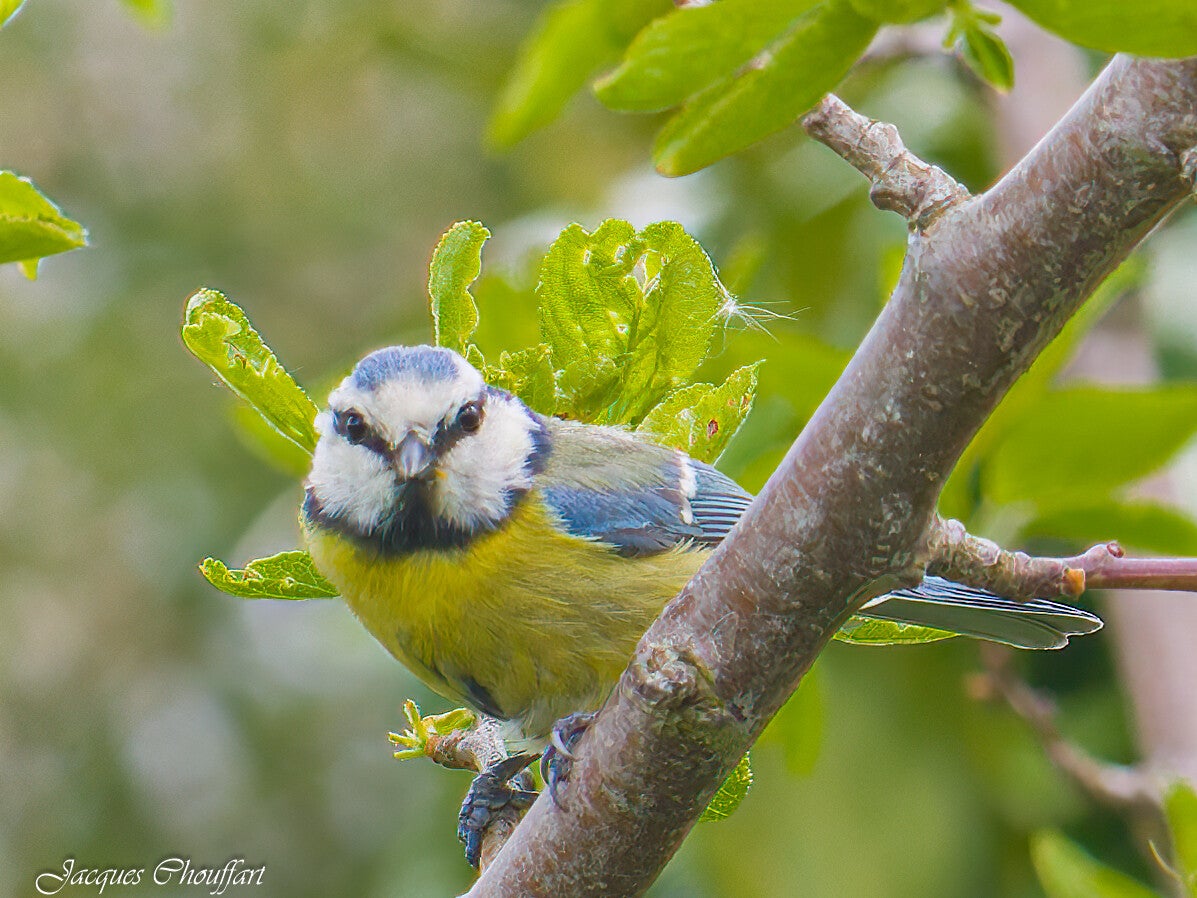 Elle a le dessous jaune avec un vague trait sombre au bas de la poitrine, une calotte bleue et un bandeau noir sur l'œil, le reste de la tête étant blanc. Elle est aussi ubiquiste que la charbonnière à laquelle elle dispute les cavités, la plus grande ayant souvent le dessus. Il est surprenant de voir cohabiter ainsi deux espèces à la biologie semblable. Elles se différencient toutefois un peu par le fait que la Mésange bleue, plus légère, exploite volontiers les branches les plus fines et les plus élevées des arbres.