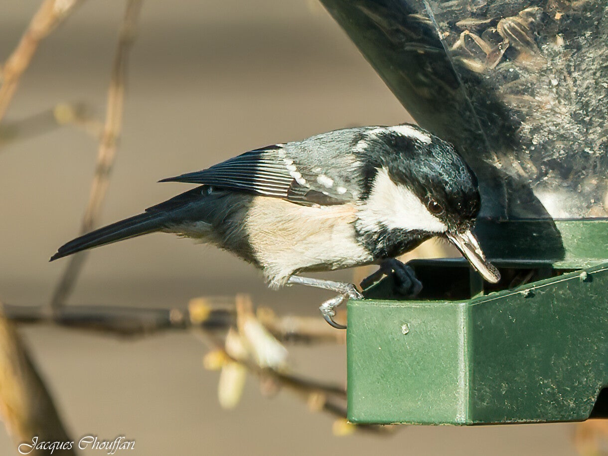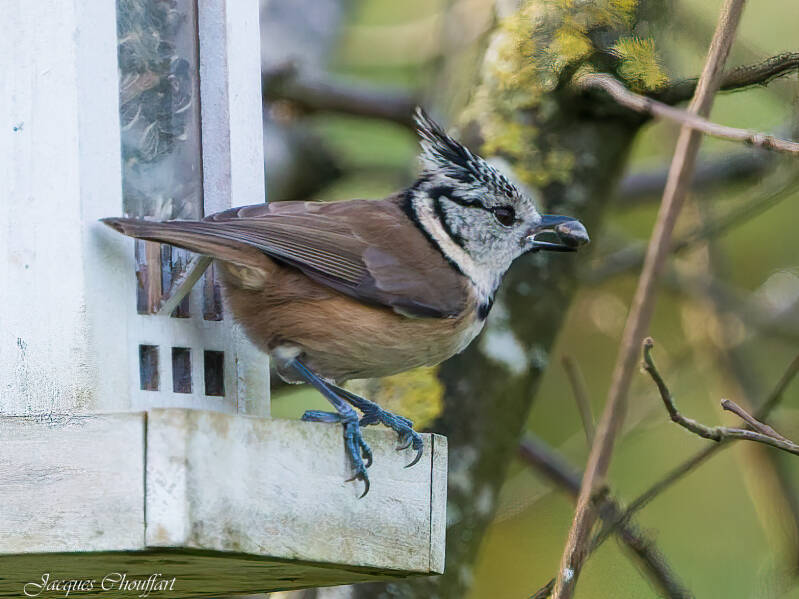 La Mésange huppée, inféodée aux résineux et facile à identifier grâce à sa huppe, vient également au nourrissage