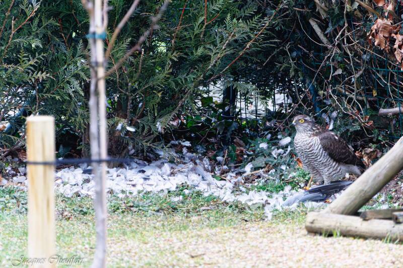 L'épervier chasse en surprenant ses proies et profite, souvent, des rassemblements de passereaux aux mangeoires.